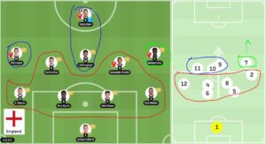 שימו לב כמה שחקנים אנגלים מאחורי החצי שלהם, בעמדות הגנתיות ונמוכות, כולל הקישור האחורי (רייס (4) וארנולד (8)), כשהשחקן האנגלי הכי קדמי היה בוקאיו סאקה (7) בכנף ימין, בעוד שגם הארי קיין (9), ג’וד בלינגהאם (10) ופיל פודן (11) היו מאד אחוריים בקרבת עיגול האמצע (הבלוק הכחול), ולא מספיק הגיעו לעמדות התקפה קדמיות. אוי לעיניים, סאות’גייט.