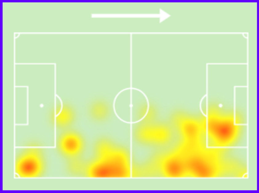 כפי שאפשר לראות, ראפיניה ירד לאיזורים מאד נמוכים בכדי לקחת חלק במשחק, ומבחינה התקפית הוא בילה את רוב המשחק על כנף ימין וגם רשם נוכחות גדולה ברחבה.
